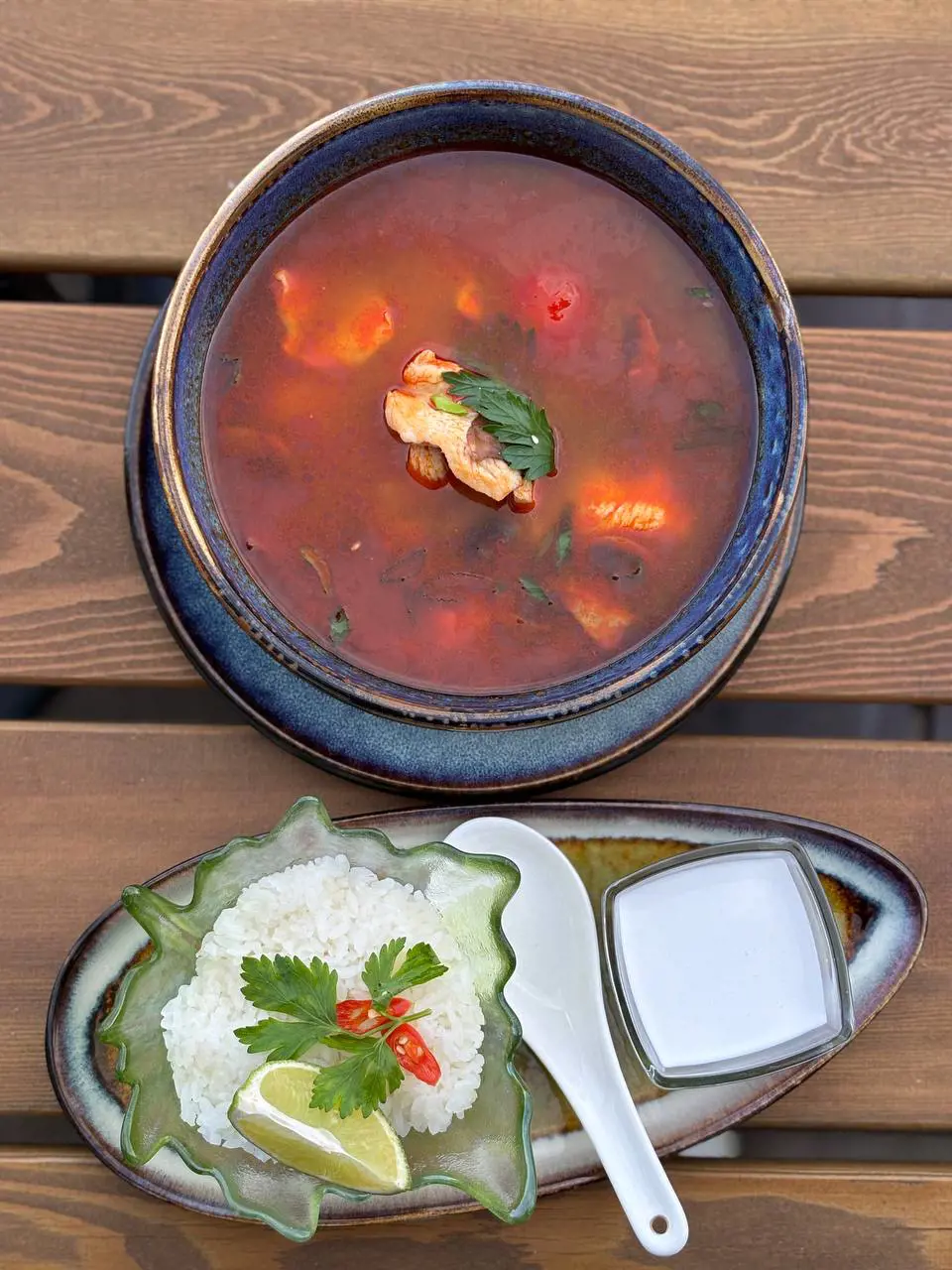 В кафе «Май Тай» вы попробуете тайское блюдо, которое покорило сердце многих – незабываемый Том Ям. Суп с креветками и соломенными грибами на курином или рыбном бульоне с добавлением кокосового молока, чеснока и веточками лайма.