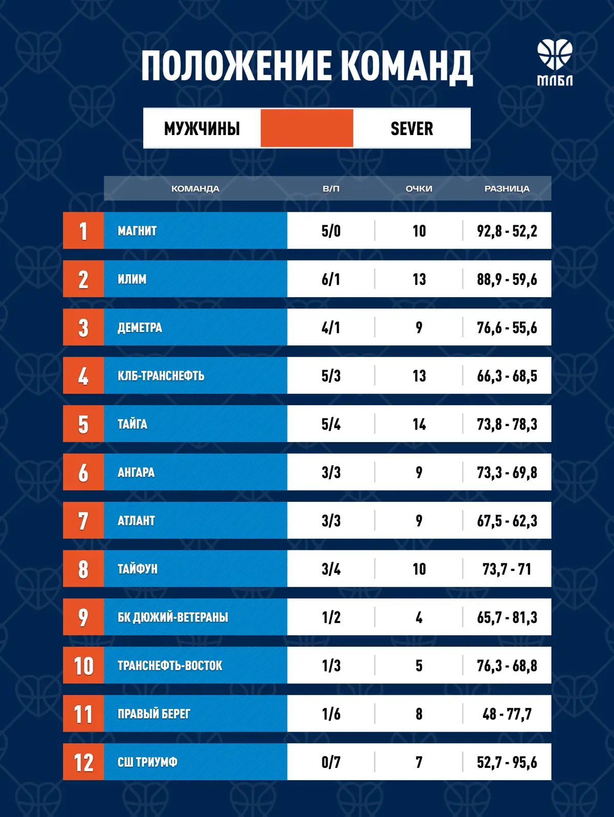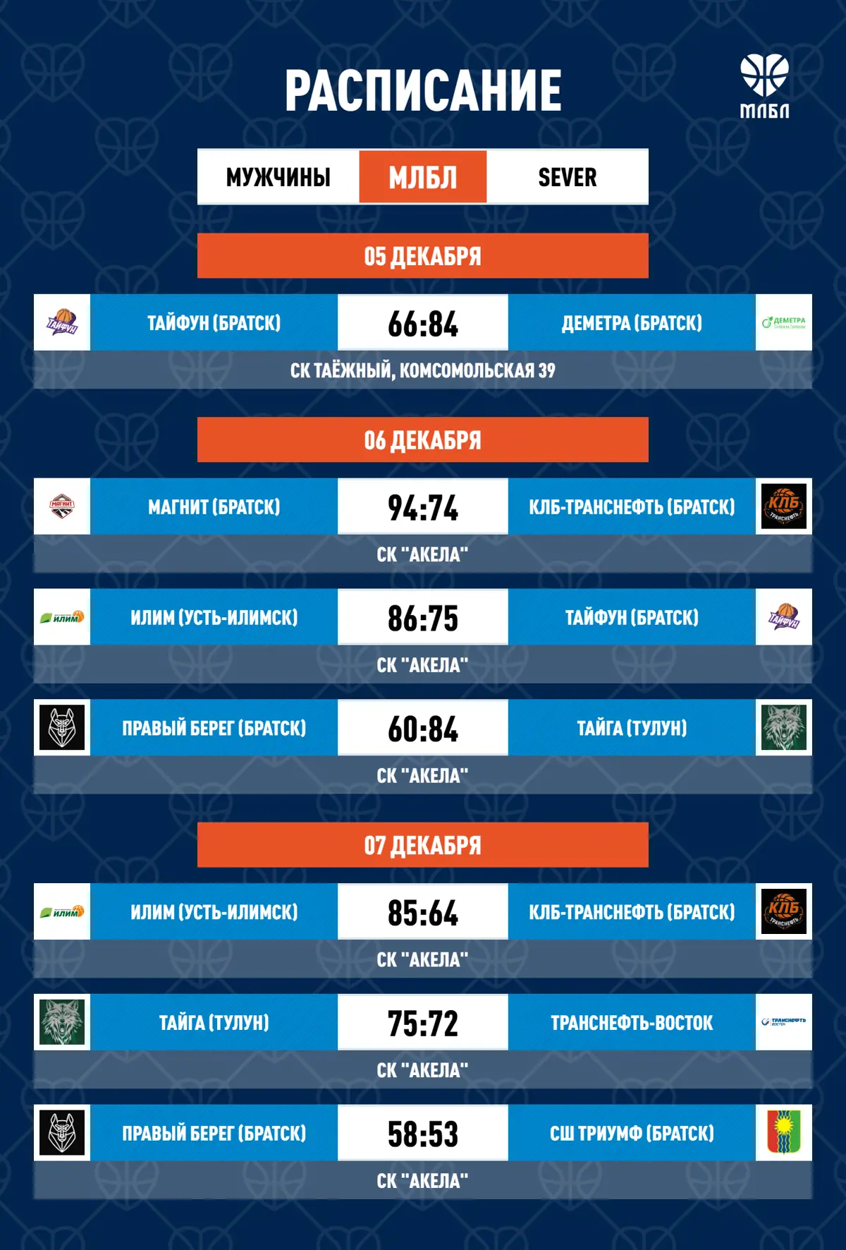 Всего за выходные баскетбольные клубы отыграли семь встреч. Команда из Усть-Илимска одержала две победы и вышла на второе место в турнирной таблице. «Тайга» из Тулуна при пяти победах замыкает пятёрку лучших. Братчане пока удерживают лидерство.