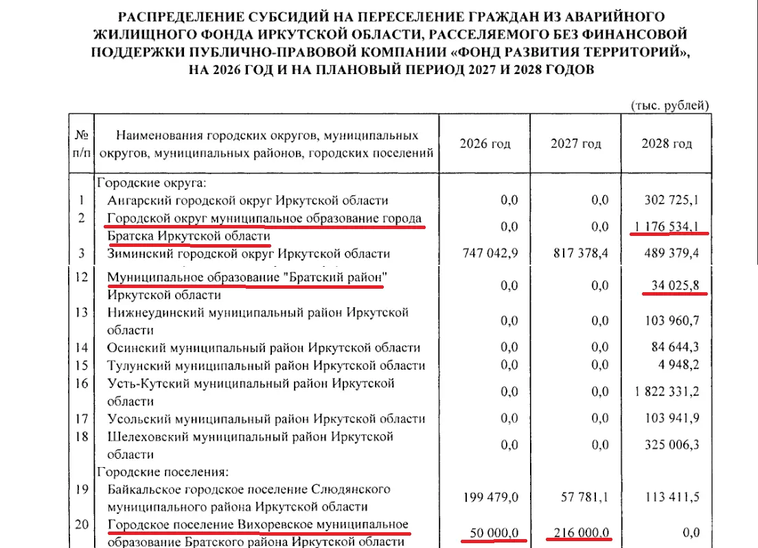 Примечательно, что для Вихоревского городского поселения финансирование по программе предусмотрено на 2026-й и 2027 годы. Правда, в весьма скромном объёме – 50 млн рублей и 216 млн рублей, соответственно. Очевидно, там будут выплачивать компенсации или приобретать жильё на вторичном рынке.