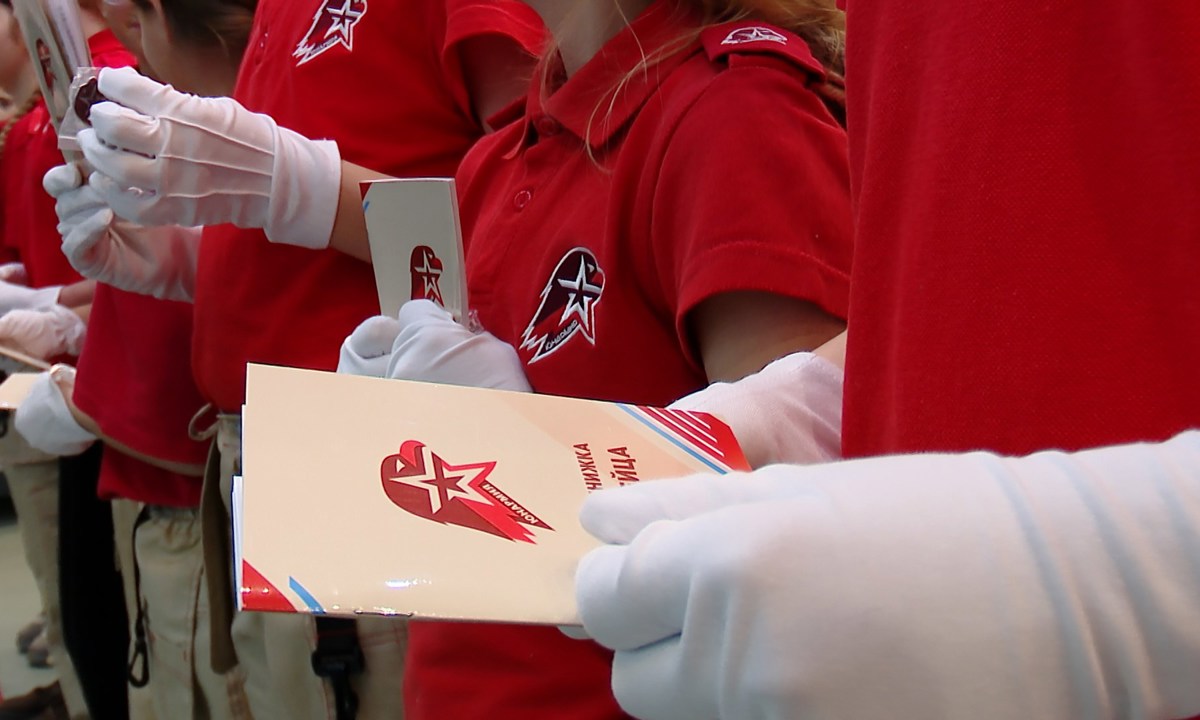 Евгений БАРАНОВ, начальник штаба местного отделения Юнармии: «Конечно, это очень важное событие, как в своё время нас посвящали в пионеры, в октябрята, так и здесь. То есть это военно-патриотическое общественное объединение – Юнармия. И они с гордостью носят свой значок и свою форму, всем выдаются удостоверения общего образца, книжка юнармейца. То есть это достаточно почётное звание».